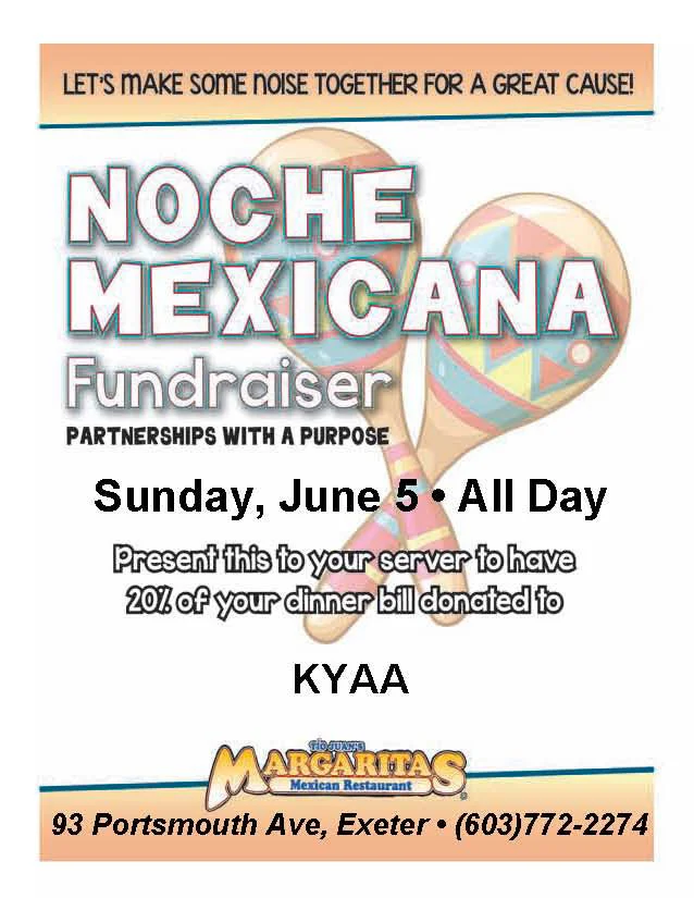 Join us at Margaritas Mexican Restaurant, 93 Portsmouth, Ave, Exeter, NH all day on Sunday, June 5, 2016. Margaritas will host a Noche Mexicana Fundraiser and donate 20% of pre-taxed food and beverage sales from participating families, friends and supporters to the KYAA. Guests can choose items from any of their menus, takeout orders included.